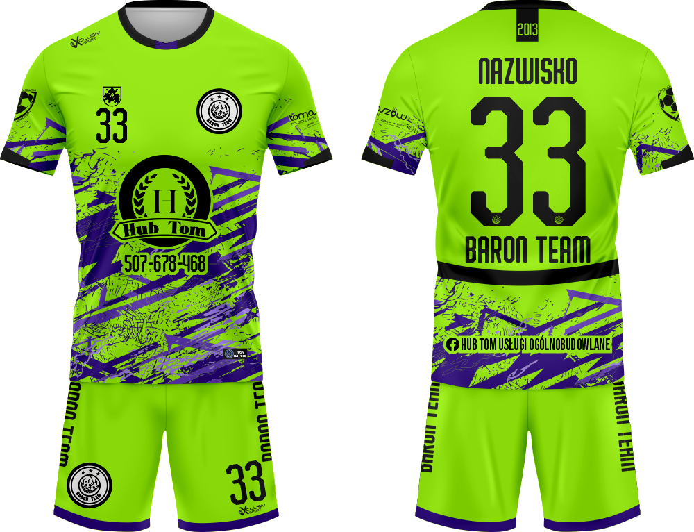 Komplet piłkarski Baron Team 2025/26 z nadrukiem to profesjonalny zestaw bramkarski stworzony z myślą o bramkarzach na każdym poziomie zaawansowania – od juniorów stawiających pierwsze kroki na boisku, po seniorów grających w ligach amatorskich i klubowych. W skład zestawu wchodzi koszulka bramkarska oraz spodenki w charakterystycznym kolorze fluo seledynowym, który zapewnia doskonałą widoczność na murawie. Dostępna szeroka skala rozmiarów – od 110 aż do 4XL – sprawia, że każdy bramkarz znajdzie strój idealnie dopasowany do swojej sylwetki.