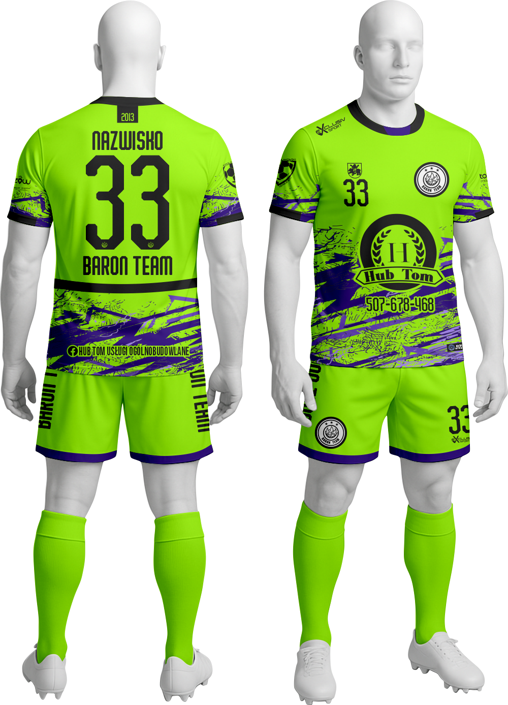 Zestaw bramkarski Baron Team wyróżnia się możliwością personalizacji z nadrukiem – numerem oraz nazwiskiem – co czyni go idealnym wyborem zarówno dla indywidualnych zawodników, jak i dla całych drużyn chcących zbudować spójny, profesjonalny wizerunek. Produkcja realizowana jest przez ExclusiVSport, polskiego producenta odzieży sportowej, co gwarantuje sprawną realizację zamówień i bezpośredni kontakt na każdym etapie. Komplet dostępny jest bez getr, co daje swobodę w doborze pozostałych elementów stroju według własnych preferencji.