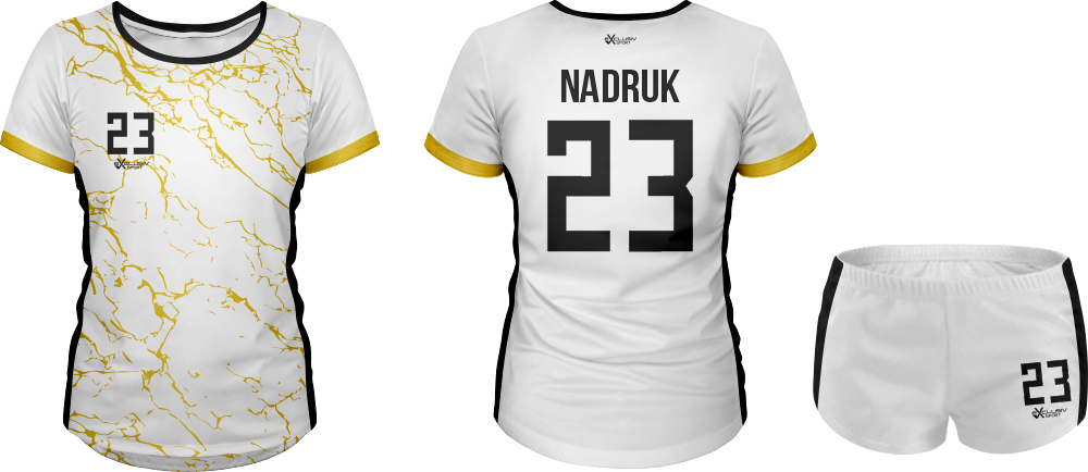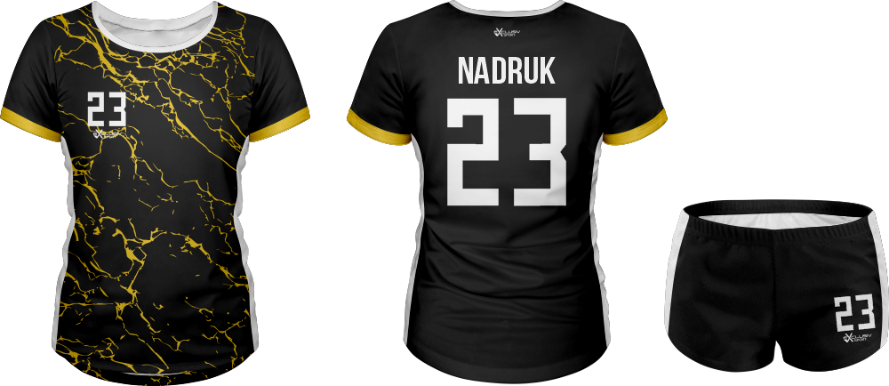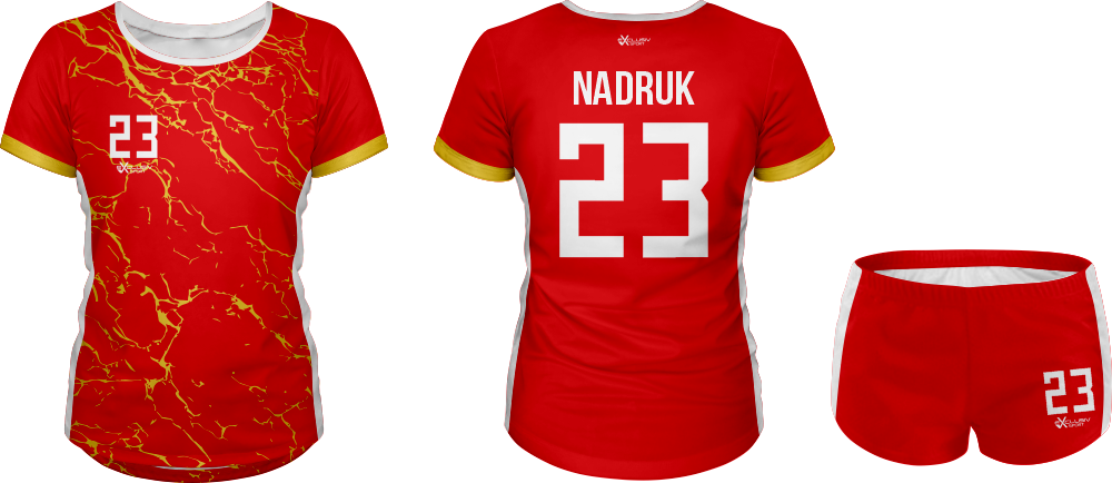 W naszych strojach wykorzystujemy druk sublimacyjny wykorzystujemy do tego tusz sublimacyjny, który nakłada się na papier do sublimacji , a następnie nadruk jest przenoszony z papieru na materiał za pomocą specjalnej prasy. Do tego procesu niezbędna jest wysoka temperatura, która pozwala na podgrzanie barwnika – zmienia on wtedy stan skupienia ze stałego na gazowy i wtedy przenika włókna poliestrowego materiału najlepszej jakości do produkcji strojów. Po przeniknięciu całego nadruku na materiał obniża się temperaturę, a włókna z przyjętym tuszem się zamykają. W ten sposób nadruk jest „wdrukowany” w materiał, a nie tylko naniesiony na jego powierzchnię. Dzięki temu jest niewyczuwalny, a także bardzo trwały – bez problemu zniesie wiele prań, co jest szczególnie ważne przy odzieży sportowej, która często trafia do pralki.